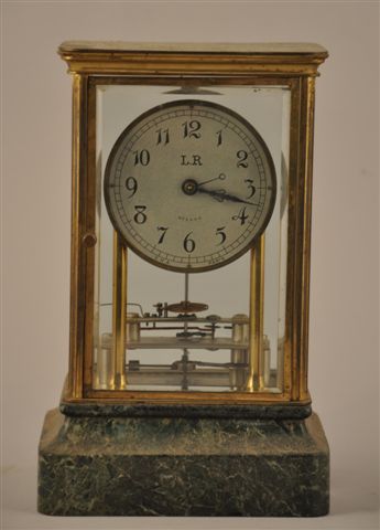 PENDULE SQUELETTE, cage en laiton et verre, reposant sur un marbre vert. Mouvement marqué : " L . R ", " S. G. D. G ", " S. M. A. " à Paris. Haut. 25, Larg. 15, Prof. 11,5 cm.