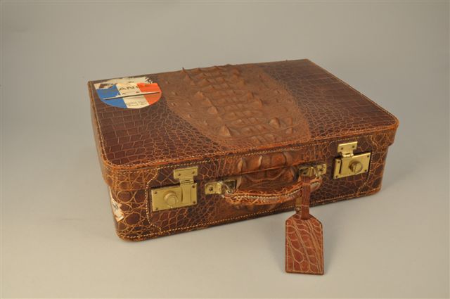 VALISE en crocodile, portant une étiquette du France (manque). Avec housse de protection en toile fauve. Haut. 12, Larg. 33, Prof. 45 cm