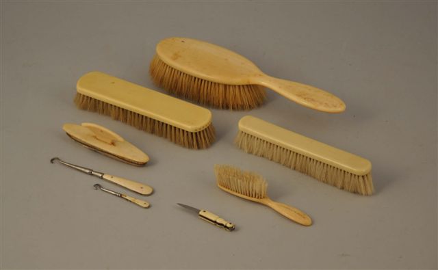 LOT comprenant une BROSSE de toilette à cheveux en ivoire, deux BROSSES à habits en composition, une petite BROSSE en ivoire marquée "Au Printemps. Paris", un POLISSOIR à ongles en composition, deux CROCHETS à BOTTINES et un petit COUTEAU pliant, le manche en composition en forme de quille. Première moitié du XXème siècle.