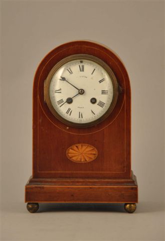 PENDULE BORNE en bois de placage à motif marqueté d'un velum en bois clair, pieds boules en métal doré. Mouvement signé LINTON à Paris. Haut. 28 cm. (manque un pied).