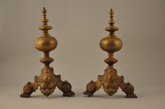 PAIRE de CHENETS en bronze la base au buste de femme couronné. Style hollandais.