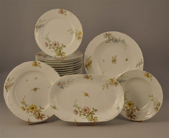 Partie de SERVICE en porcelaine 36 pièces à décor floral comprenant 25 assiettes plates, 8 assiettes creuses, 2 plats ovales et un plat de présentation rectangulaire à pans coupés (accidents).