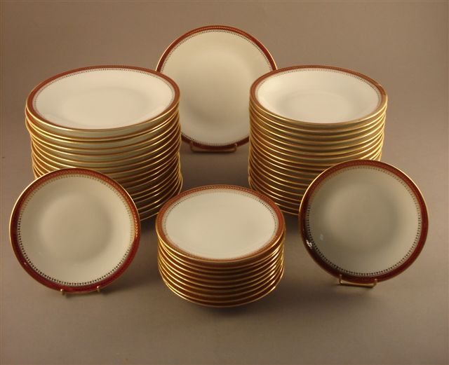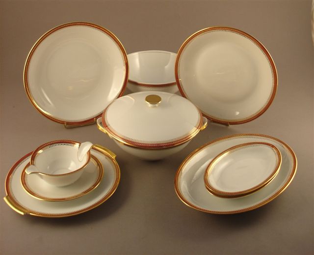 LIMOGES. Partie de SERVICE en porcelaine de 58 pièces comprenant 18 assiettes plates, 18 assiettes creuses, 13 assiettes à dessert, 1 soupière, 1 saucière, 1 saladier, 2 raviers et 4 plats. Dans l'état.