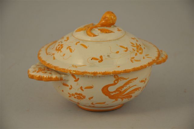 BOUILLON à oreilles en faïence dans le goût de Moustier à décor d'oiseaux en ocre. Couvercle à prise en fruit. Diam. 17,5 cm.