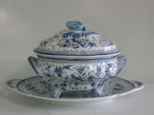 SOUPIÈRE et son dormant en faïence dans le goût de Delft.