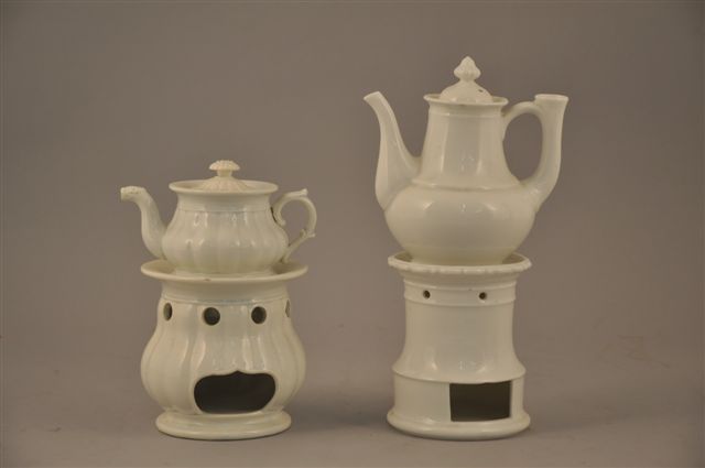 2 TISANIÈRES, l'une en faïence fine de CREIL et MONTEREAU, le corps à côtes melon(égrenure au couvercle, godet accidenté), l'autre en porcelaine de style Louis-Philippe.