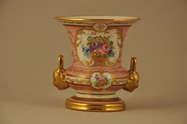 Petit VASE médicis en porcelaine à décor polychrome et or de paniers fleuris. Les anses en appliques à décor de Chinois, par Le Tallec, marqué " spécialement fait pour la Marquise de Sévigné ". Haut. 14,5 cm.