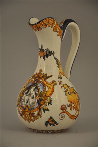 GIEN. PICHET en faïence à décor de la Renaissance, Amour chevauchant un dauphin dans un cartouche couronné. Marqué. Haut. 24 cm.