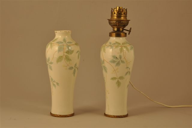Paire de VASES balustres à décor polychrome feuillagé, marqués Sèvres. L'un monté en lampe. Haut. 22,5 cm (accdts et restaurations)