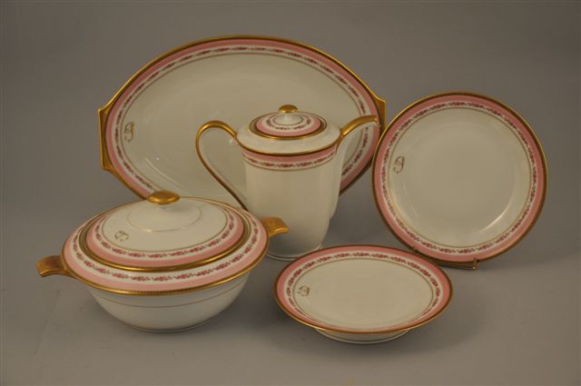 SERVICE en porcelaine blanche, 51 pièces, à filet de roses épanouies : 12 assiettes plates, 24 assiettes creuses, 1 cafetière, 1 sucrier couvert, 2 assiettes montées, 3 légumiers couverts, 1 plat oblong, 1 plat rond.