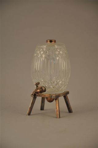 FONTAINE À WHISKY en cristal de forme tonneau, décor godronné et taillé en pointe de diamant, repose sur un piètement en métal argenté. Travail anglais. Haut. 21 cm. (manque le bouchon).