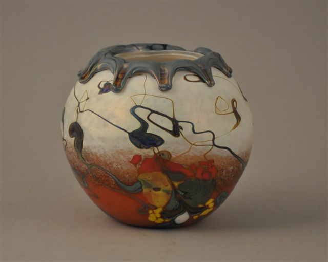 VASE boule en verre irisé à décor psychédélique, application à chaud au col.