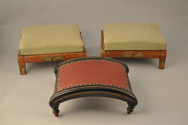 Joint : un REPOSE-PIED en bois noirci et or. Garniture de cuir cloutée. Fin du XIXème.