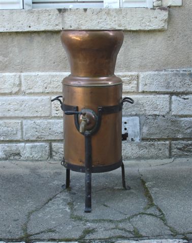 ALAMBIC en cuivre à deux robinets avec un accessoire, monture en fer. Marqué " A. L ".