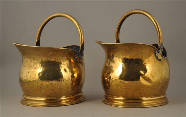 PAIRE DE SEAUX à charbon, en cuivre jaune, munis de leurs anses, becs verseurs arrondis.
