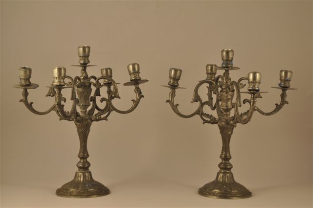 Paire de CANDÉLABRES en étain à 5 bras de lumière à motifs de dauphins et volutes feuillagées, modernes. Haut. 38,5 cm.