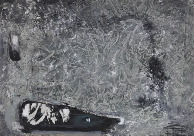 Gouache et collage sur papier argenté, marouflée sur carton, signée en bas à droite