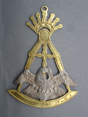 BIJOU MAÇONNIQUE de chevalier ROSE-CROIX en bronze doré et métal argenté décoré d'un compas , Rose-Croix stylisée et pélican nourrissant de son sang ses petits. Surmonté d'une couronne stylisée avec son anneau.
