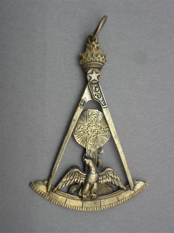 BIJOU MAÇONNIQUE de chevalier ROSE-CROIX en bronze doré décoré de l'inscription INRI, d'un compas, Rose-Croix et pélican nourrissant de son sang ses petits. Surmonté d'une étoile et d'une couronne stylisée. Avec son anneau.