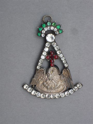 BIJOU MAÇONNIQUE de chevalier ROSE-CROIX en bronze argenté et pierres de couleur. Décoré d'un compas, d'une Rose-Croix et d'un pélican nourrissant de son sang ses petits. Surmonté d'une couronne. Avec son anneau.