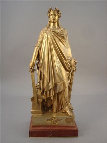 ALLÉGORIE DE LA RÉPUBLIQUE. Représentée à l'antique, la République annonce la venue d'un nouvel ordre. Ceinte d'une couronne de chêne, à la manière des grandes prêtresses de l'Antiquité, elle symbolise la victoire de la sagesse et la raison. Dans sa main gauche, elle tient un faisceau d'armes foulant la couronne royale brisée. De sa main droite, elle pointe l'épée vers la Constitution de la France qu'elle entend défendre au nom des idéaux de Liberté et de Fraternité gravés dans un triangle. Statue en bronze doré sur un socle en marbre rouge. Signée à gauche sur le socle. Cartel "1er PRIX. STATUE OFFICIELLE DE LA RÉPUBLIQUE - SOITOUX". Inscription sur le socle à droite "J. MALARMET. Edr". Au centre de la couronne de chêne, manque l'étoile.