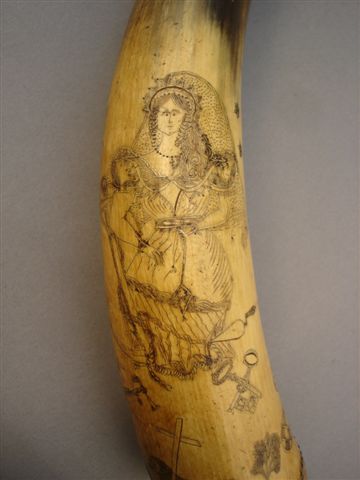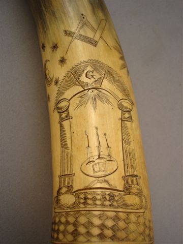 CORNE À POUDRE gravée de symboles maçonniques. Sur une face, sont représentés l'entrée d'un temple, deux colonnes, l'autel, l'Oeil, l'équerre et le compas, la lune, le soleil. Sur l'autre face, une jeune fille en robe de mariée tient dans sa main droite une ancre, symbole de l'espoir. Elle est entourée d'autres symboles tels que les clés, l'Agneau et la Croix. Ce genre de travail était souvent exécuté par les soldats lors de la traversée qui les conduisait vers le Canada.