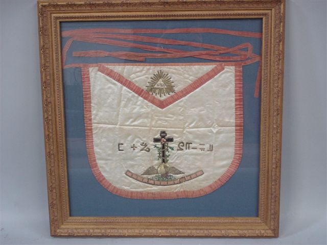 TABLIER de CHEVALIER ROSE-CROIX en soie brodée. Au pied de la Rose-Croix, un pélican nourrit de son sang ses petits. Sur l'empiècement triangulaire, le Delta et lettres hébraïques. Décor rayonnant en strass doré.