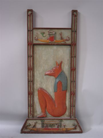 PANNEAU ÉSOTÉRIQUE de forme rectangulaire en chêne sculpté polychrome d'inspiration égyptienne. Décor compartimenté de bateaux, fleurs de lotus et personnages sur fond vert. Au centre, entre les deux montants sculptés d'éléments géométriques stylisés, figure une représentation stylisée du dieu Anubis assis. Base trapézoïdale.