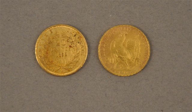 VINGT FRANCS OR, 2 pièces : 1858, 1910.