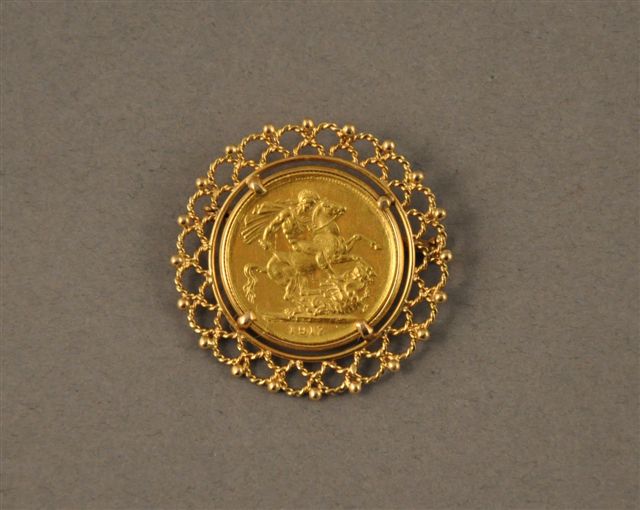 "Saint Georges", pièce anglaise en or, 1917. Montée sur broche en or jaune. Poids brut : 12 g.