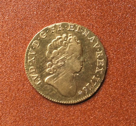 Louis d'or aux insignes, 2e type, flan neuf, 1716, atelier C = Caen, 6h, 8,13 g, tranche cordonnée.
