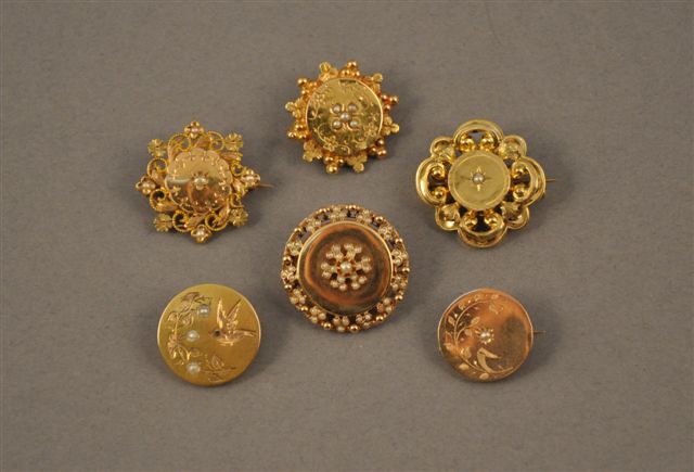 6 BROCHES en or rondes, aux entrelacs, perles, demi-perles. Poids : 13,4 g.