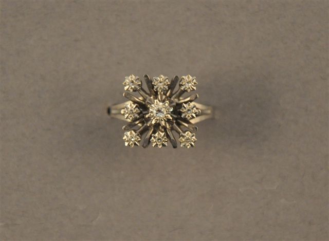 BAGUE en or gris, sertie au centre d'un petit diamant de taille brillant dans un entourage de forme carrée de diamants taillés en huit-huit. Poids brut : 4 g.