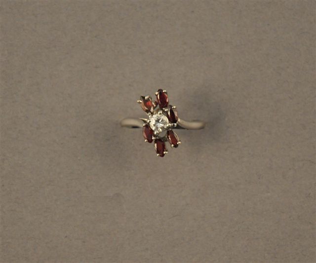 BAGUE en or blanc ornée d'un diamant d'environ 0,20 carat, dans un entourage de 6 pierres rouges en navette. Poids brut : 3,6 g.