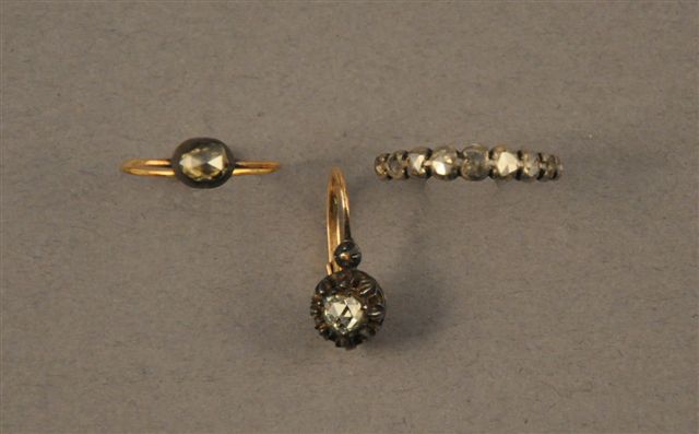 LOT en argent et or, comprenant : deux BAGUES et une BOUCLE d'OREILLE, serties de diamants taillés en rose. Poids brut : 4 g.