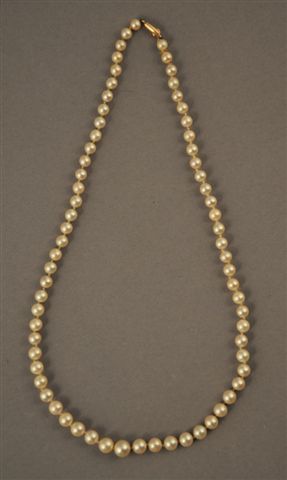 COLLIER DE 69 PERLES DE CULTURE, en chute. Fermoir olive en or jaune. Long. 53 cm.