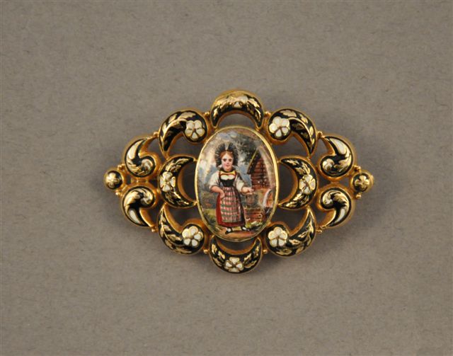 BROCHE ovale en or jaune ajouré, émaillée noir et blanc, le centre orné d'un enfant en émail polychrome. XIXème siècle. Poids brut : 6 g.