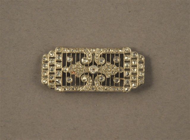 BROCHE PLAQUE rectangulaire en or blanc, motif voluté à palmette double centré d'un diamant de taille ancienne, dans un entourage de diamants taillés en rose, extrémités en escalier. Poids brut : 10,7 g. Dans un écrin en maroquin fauve.