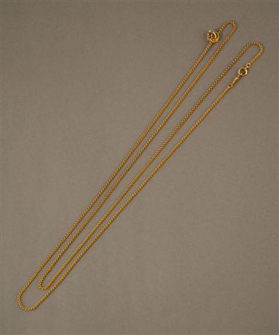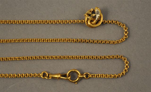 SAUTOIR en or jaune à deux doubles maillons ronds, orné d'un serre-foulard en or jaune à décor de serpent, les extrémités ornées d'un anneau ressort et d'un mousqueton. Poids : 45 g. Long. 73 cm.
