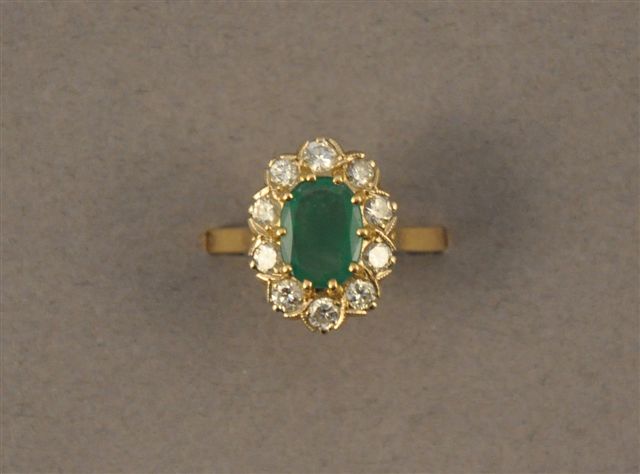 BAGUE en or jaune, sertie d'une émeraude ovale dans un entourage de diamants. (givres assimilables à des fêles). Poids brut : 6 g.