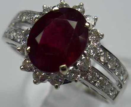 BAGUE en or blanc ornée d'un rubis ovale, probablement Birman, en serti griffes, d'environ 2 carats dans un entourage de 14 diamants de taille moderne, et de 16 diamants à l'épaulement sur deux lignes, totalisant environ 0.60 carat. Poids brut : 5,05 g.
