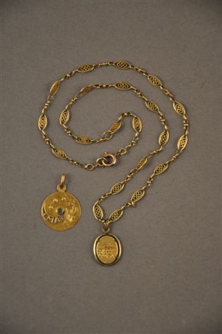 LOT comprenant une MÉDAILLE ronde "Mai" en or rose et jaune à décor d'un brin de muguet, centrée d'une pierre bleue, un COLLIER en or jaune à maillons olives filigrannés. Poids brut : 9 g.