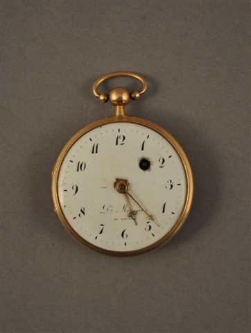 MONTRE de poche à clef, à remontage par le devant en or jaune uni, la carrure godronnée, cadran émaillé blanc, chiffres arabes, carré de remontage à deux heures, mouvement à coq, échappement à roue de rencontre. (Manque le verre). Double platine gravée MOURIER au LOCLE. XIXème siècle. Poids brut : 77 g.