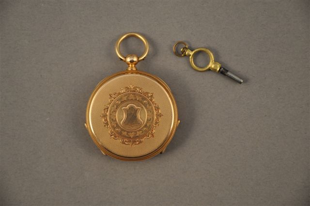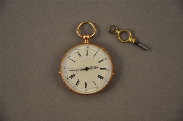 MONTRE de poche à clef, à remontage par le fond, en or jaune guilloché, gravé d'un cartouche uni, cadran émaillé blanc, chiffres romains pour les heures, arabes pour les minutes, échappement à cylindre. Poids brut : 60 g.