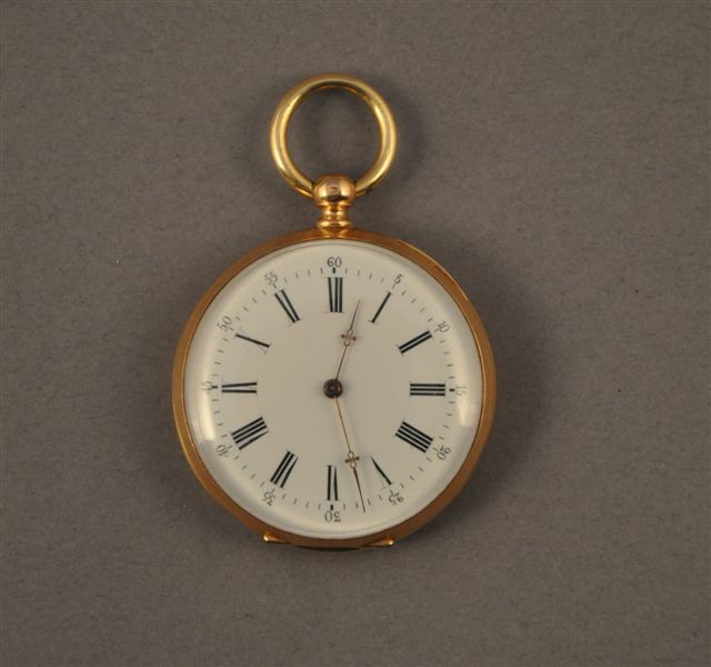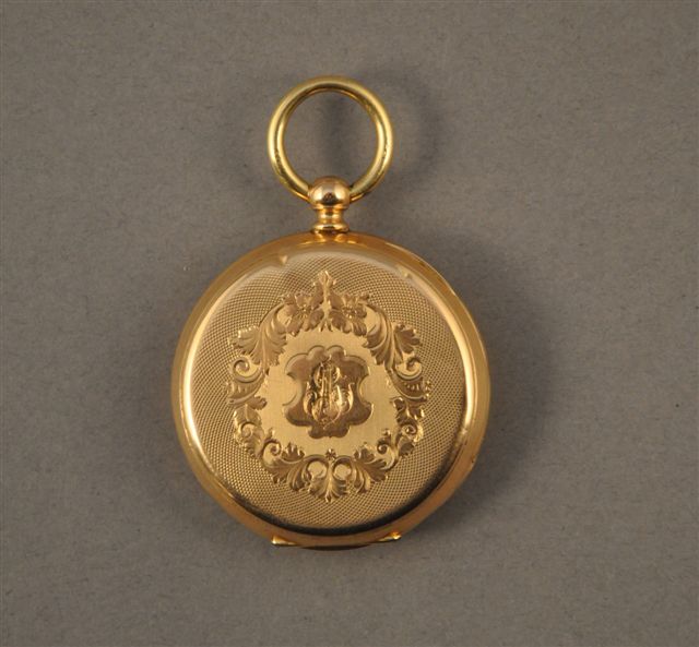 MONTRE À CLEF d'homme en or. Boitier amati, rinceaux et initiales dans un écusson. Cadran émaillé à chiffres romains pour les heures et arabes pour les minutes. Poids brut : 61 g. (petit choc)