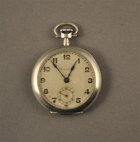 MONTRE-CHRONOMÈTRE de gousset en argent, cadran à chiffres arabes, dos gravé de rayures et d'un cartouche monogrammé I.B. Poids brut : 46 g. (molette du remontoir en métal, postérieure).