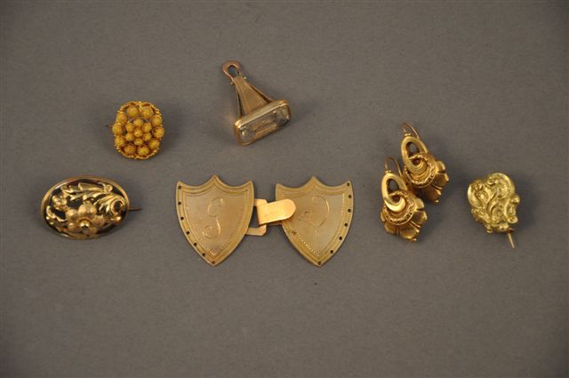 LOT en or et métal, comprenant : un pendentif cachet, une boucle de ceinture, trois broches et une paire de boucles d'oreilles. Poids brut : 33 g. Vendu comme bris.