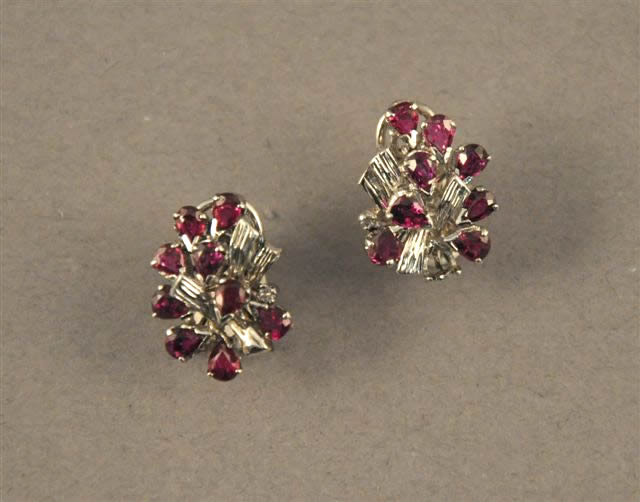 PAIRE DE BOUCLES d'OREILLES, système pour oreilles percées, en argent, serties de rubis facettés de forme poires et pierres d'imitation blanches. Poids brut : 7 g. (manque un rubis).