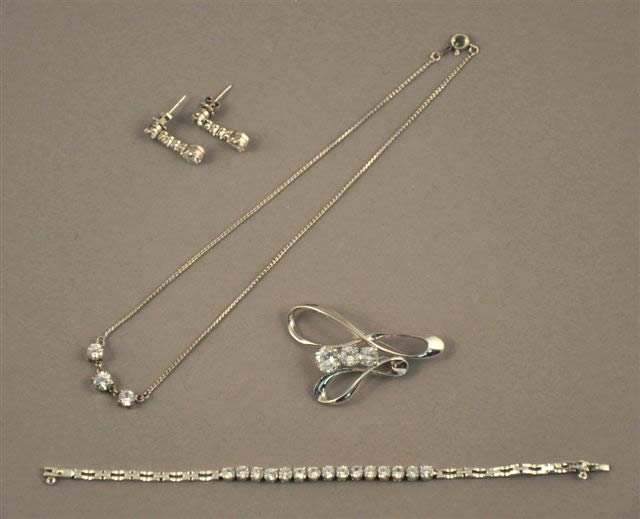 ENSEMBLE de bijoux en métal argenté partiellement sertis de pierres d'imitation blanches comprenant : un bracelet "ligne" articulé, une broche et une paire de pendants d'oreilles pour oreilles percées.