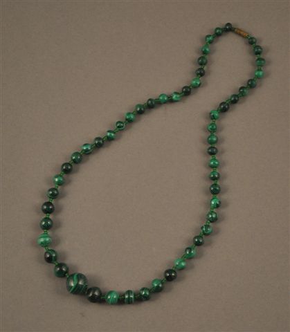 COLLIER de perles en malachite, en chute, alternées de perles de verre. Long. 60 cm.